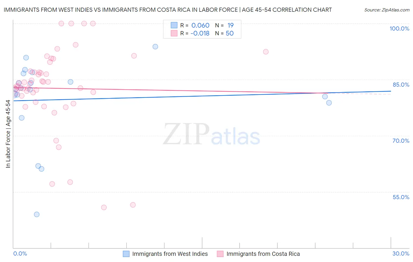 Immigrants from West Indies vs Immigrants from Costa Rica In Labor Force | Age 45-54 Correlation Chart