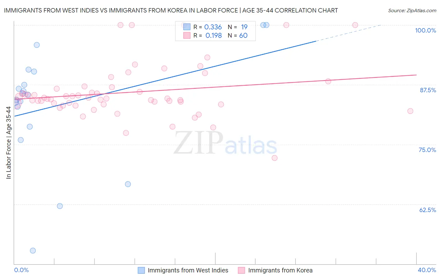 Immigrants from West Indies vs Immigrants from Korea In Labor Force | Age 35-44 Correlation Chart