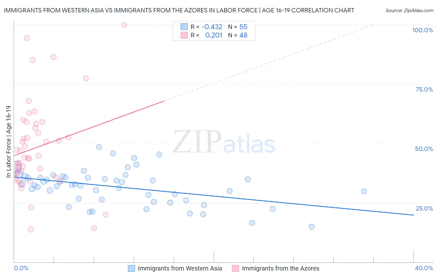 Immigrants from Western Asia vs Immigrants from the Azores In Labor Force | Age 16-19 Correlation Chart