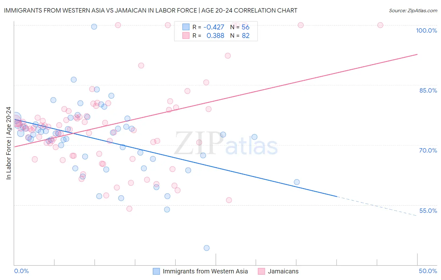 Immigrants from Western Asia vs Jamaican In Labor Force | Age 20-24 Correlation Chart