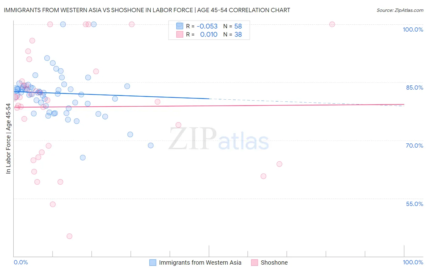 Immigrants from Western Asia vs Shoshone In Labor Force | Age 45-54 Correlation Chart