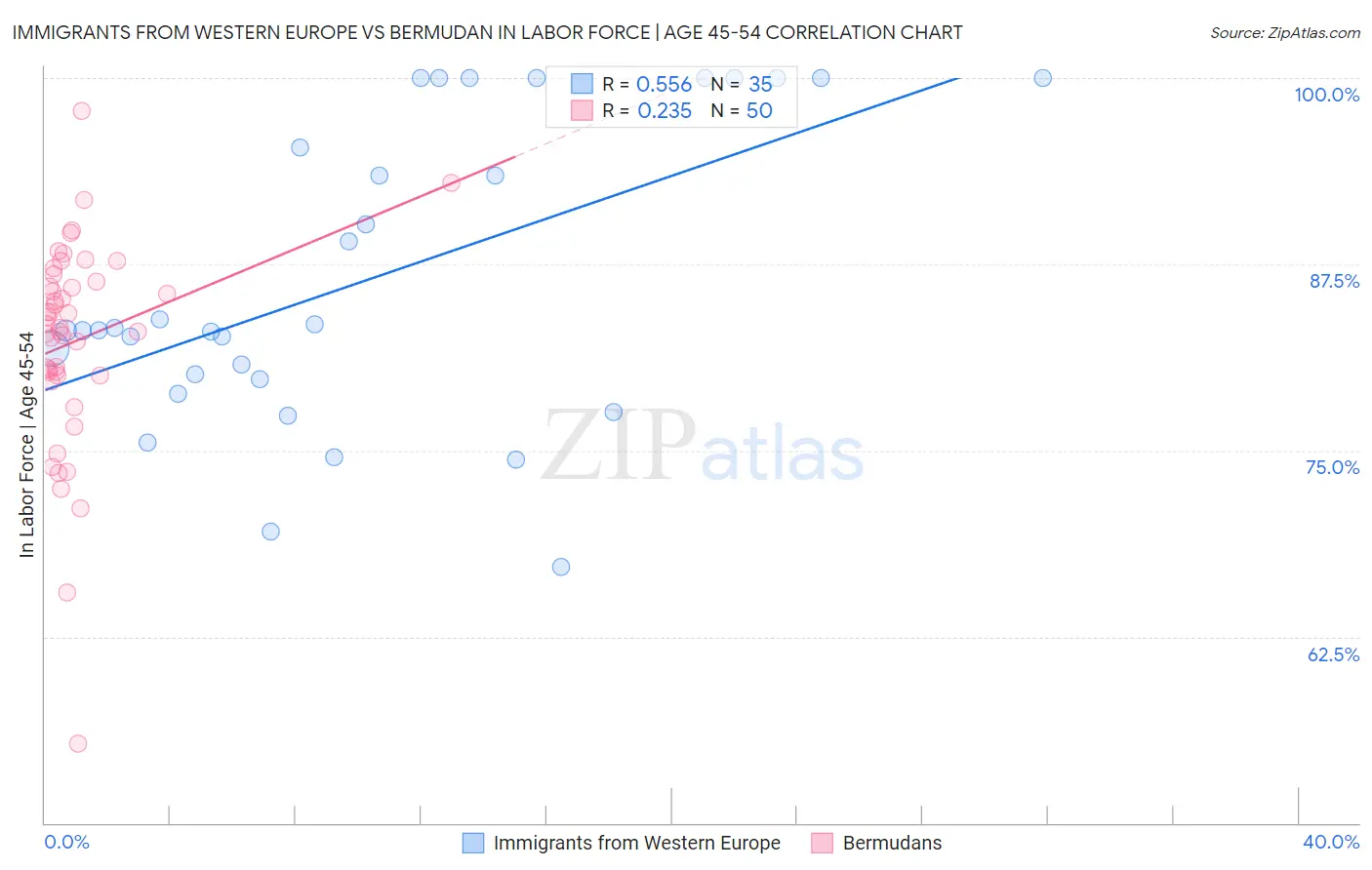 Immigrants from Western Europe vs Bermudan In Labor Force | Age 45-54 Correlation Chart