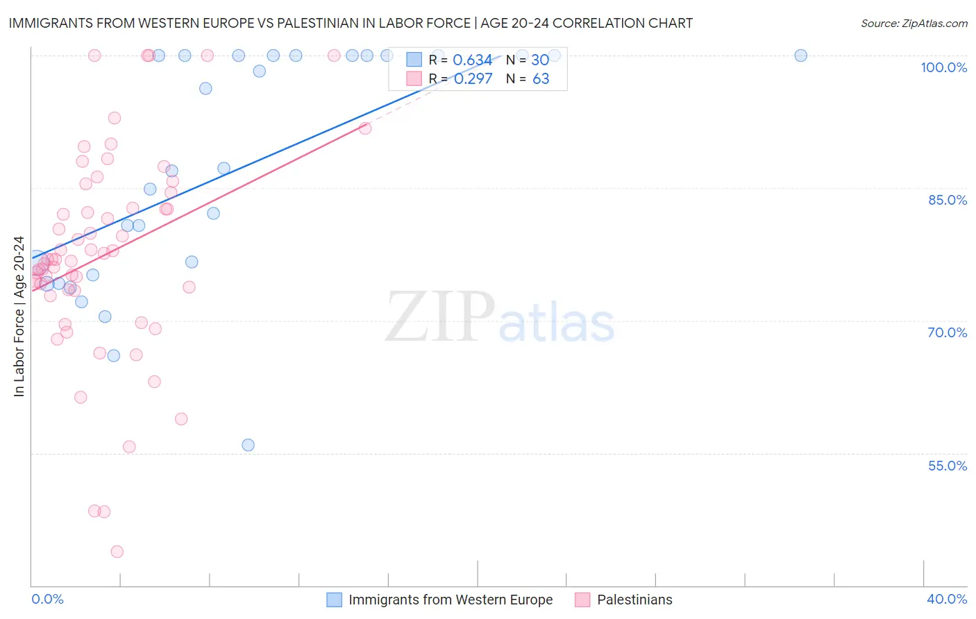 Immigrants from Western Europe vs Palestinian In Labor Force | Age 20-24 Correlation Chart