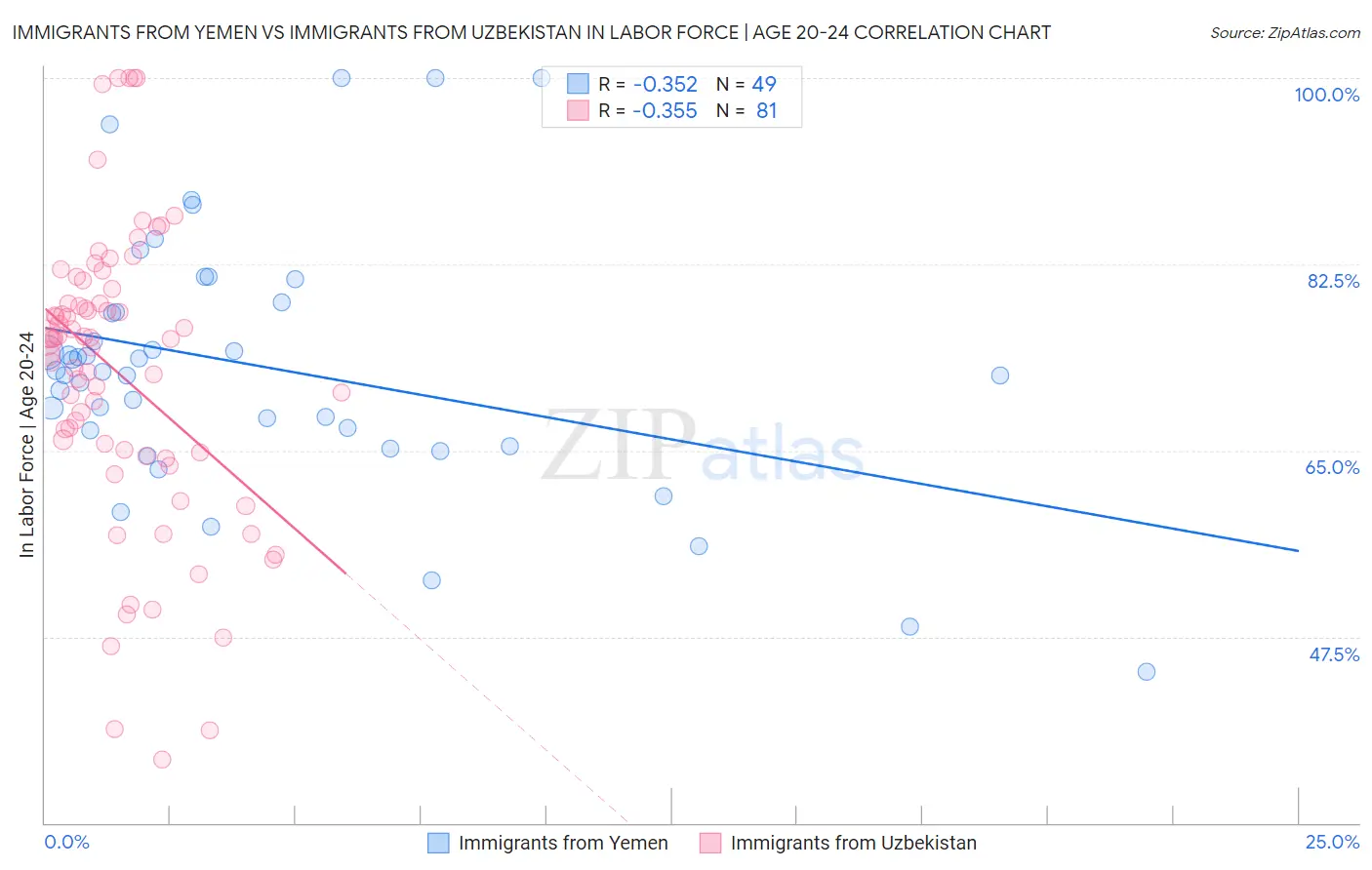 Immigrants from Yemen vs Immigrants from Uzbekistan In Labor Force | Age 20-24 Correlation Chart