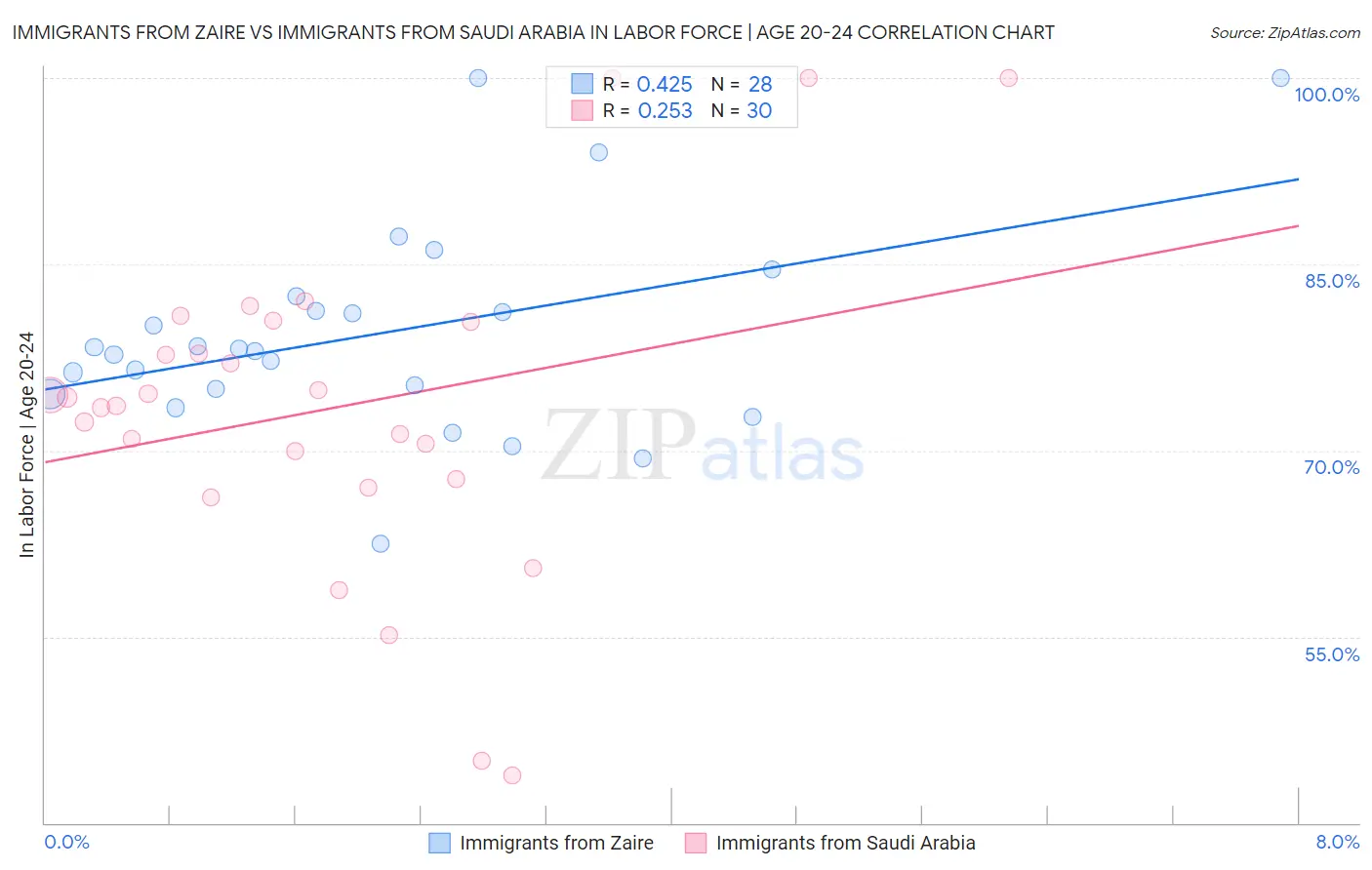 Immigrants from Zaire vs Immigrants from Saudi Arabia In Labor Force | Age 20-24 Correlation Chart