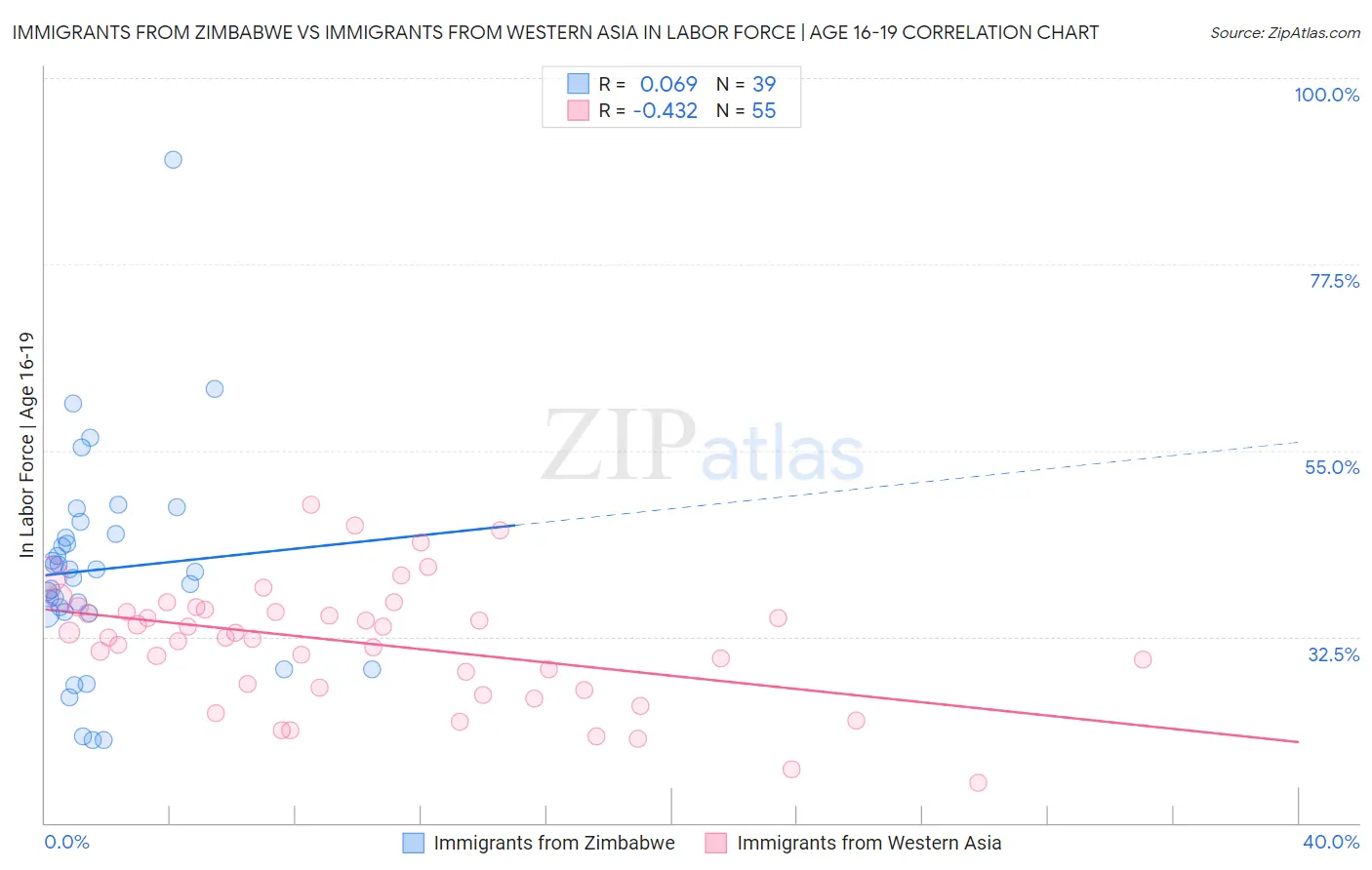 Immigrants from Zimbabwe vs Immigrants from Western Asia In Labor Force | Age 16-19 Correlation Chart