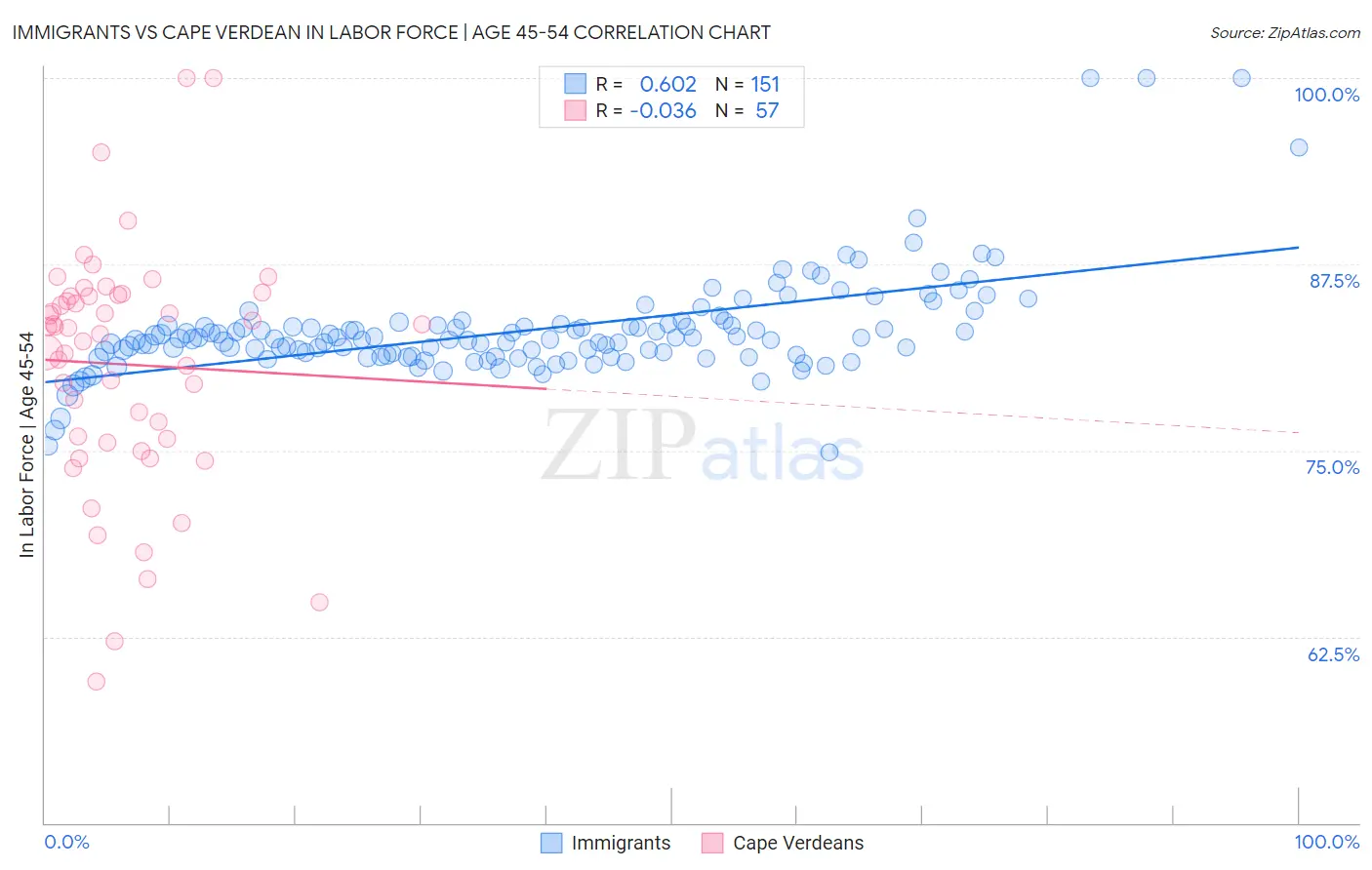 Immigrants vs Cape Verdean In Labor Force | Age 45-54 Correlation Chart