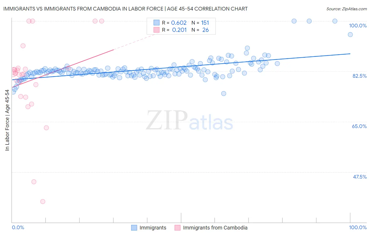 Immigrants vs Immigrants from Cambodia In Labor Force | Age 45-54 Correlation Chart