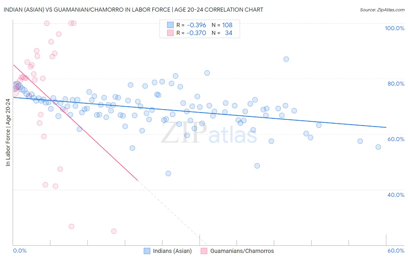 Indian (Asian) vs Guamanian/Chamorro In Labor Force | Age 20-24 Correlation Chart