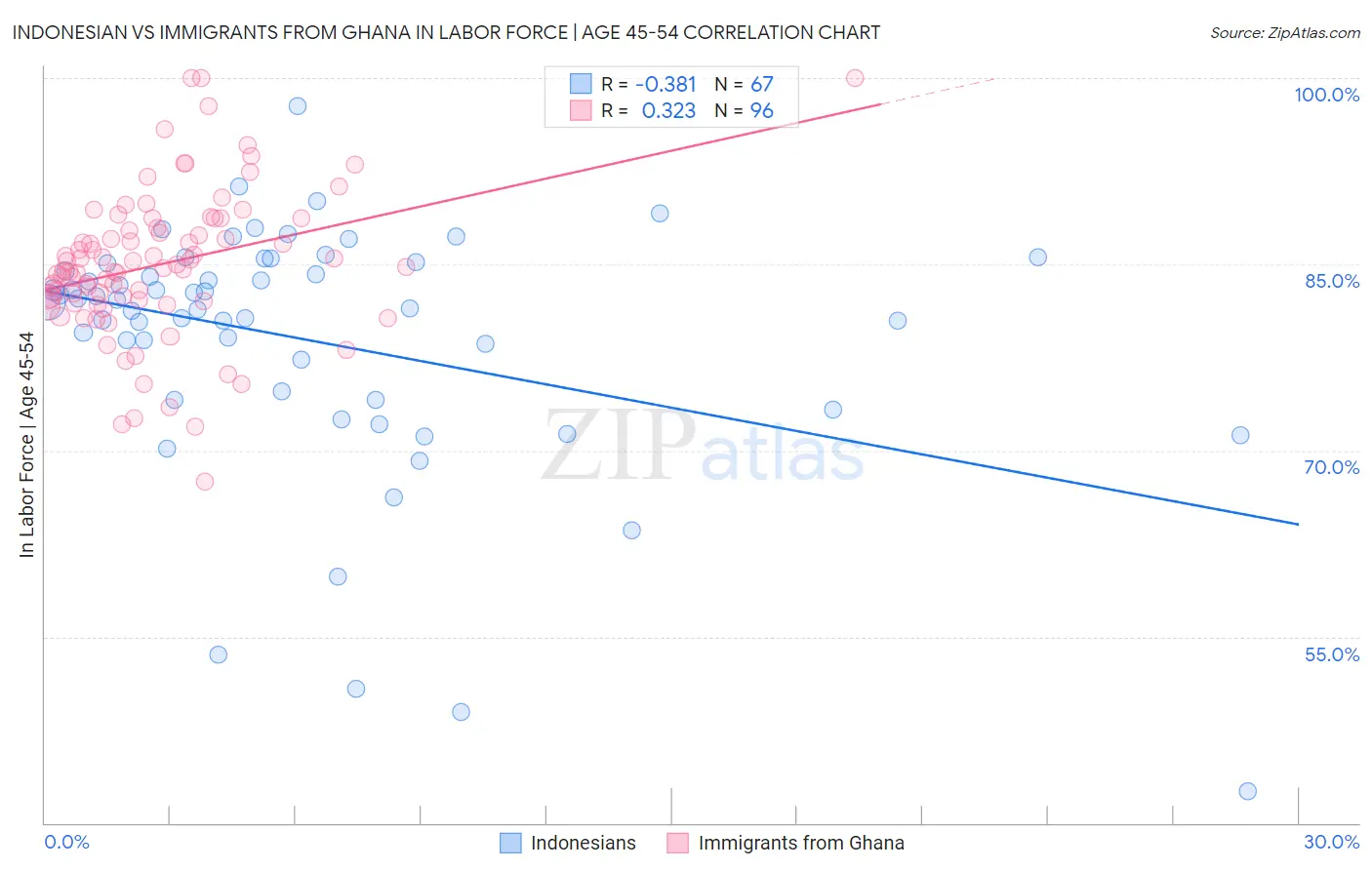 Indonesian vs Immigrants from Ghana In Labor Force | Age 45-54 Correlation Chart