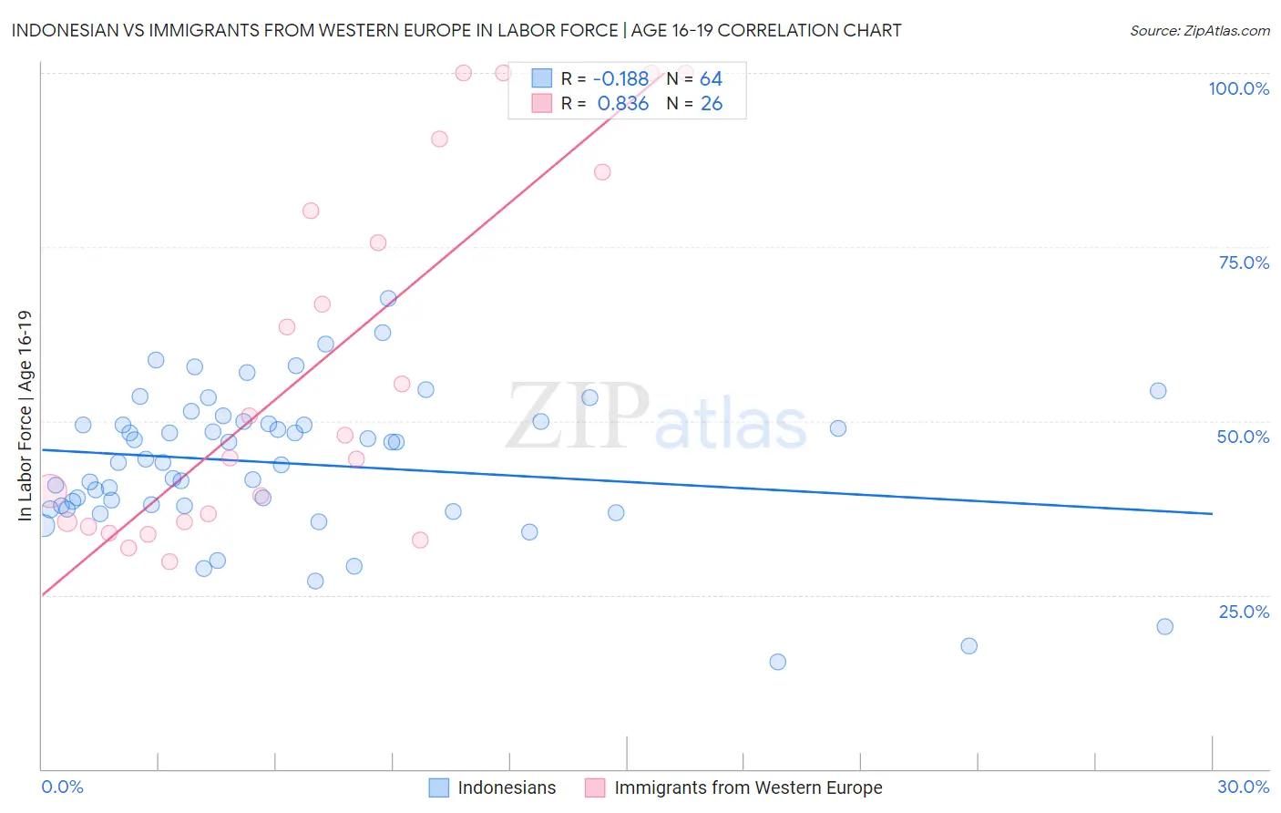 Indonesian vs Immigrants from Western Europe In Labor Force | Age 16-19 Correlation Chart