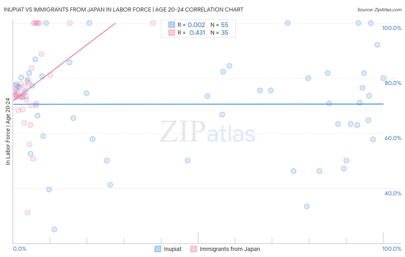 Inupiat vs Immigrants from Japan In Labor Force | Age 20-24 Correlation Chart