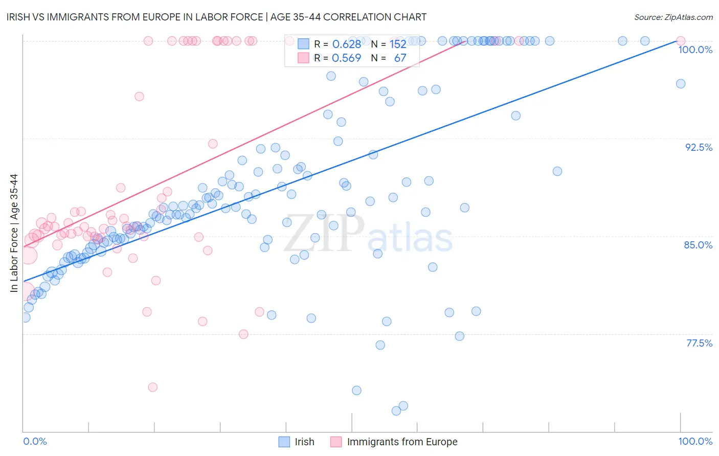 Irish vs Immigrants from Europe In Labor Force | Age 35-44 Correlation Chart