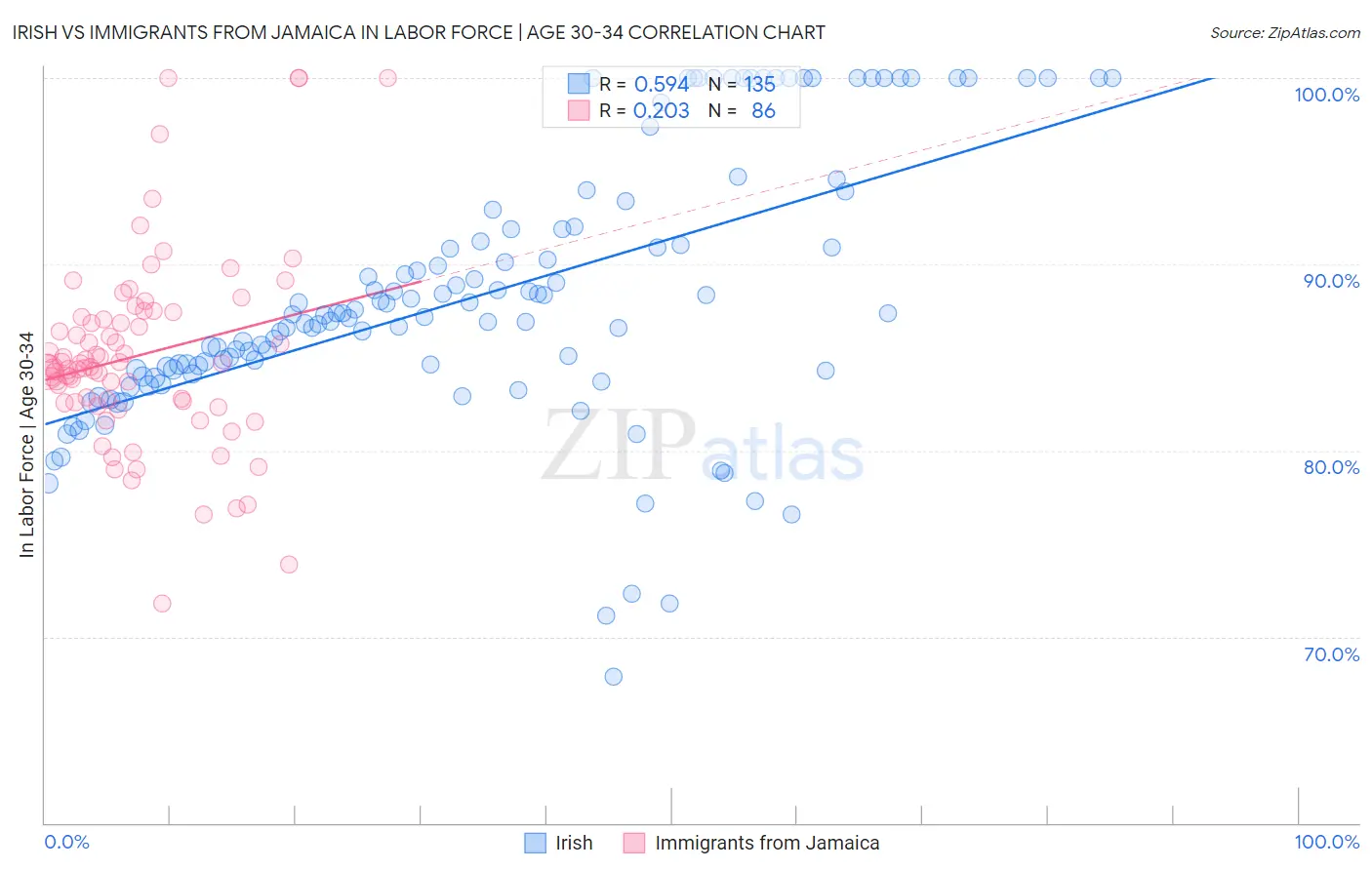 Irish vs Immigrants from Jamaica In Labor Force | Age 30-34 Correlation Chart