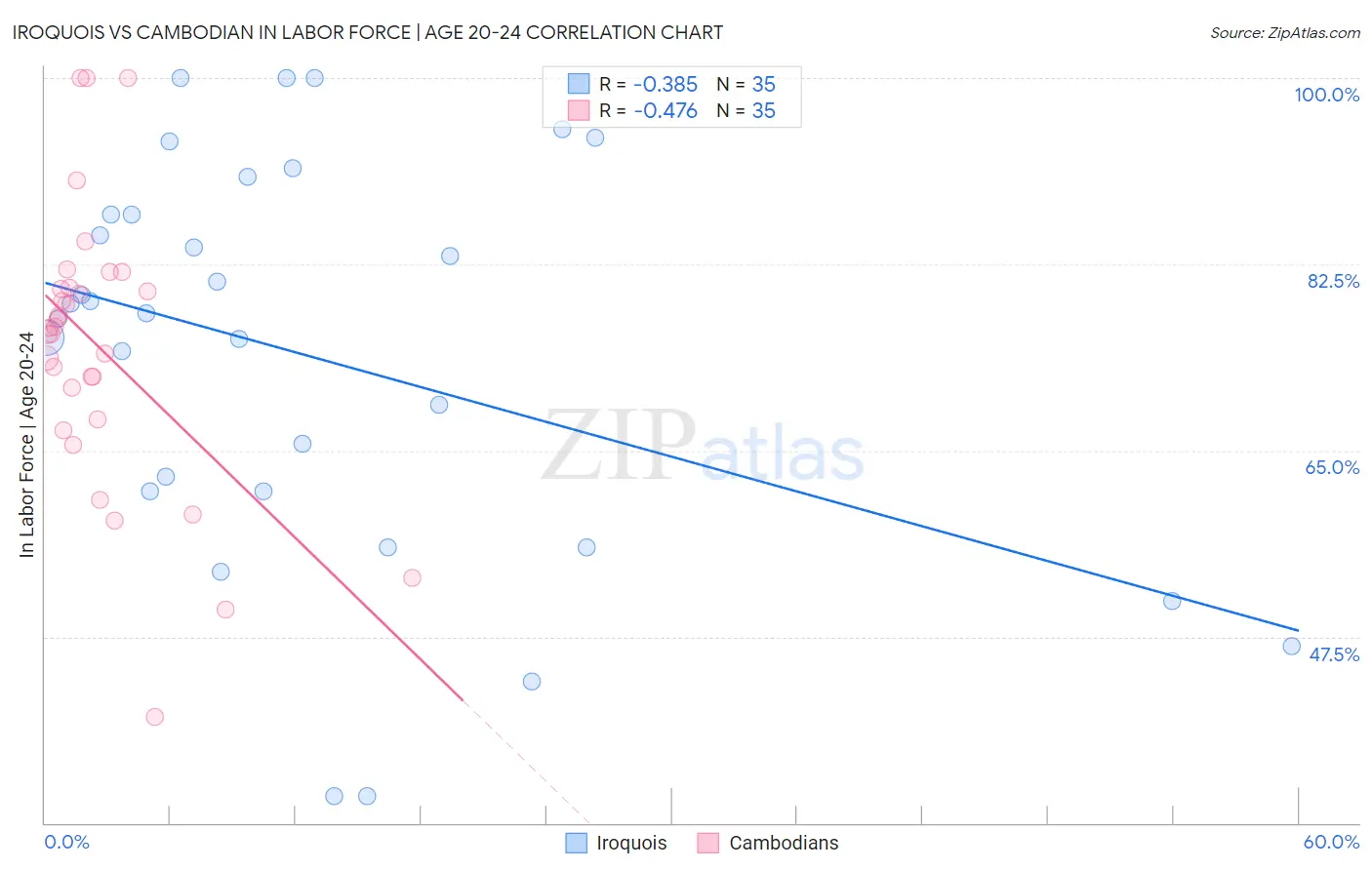 Iroquois vs Cambodian In Labor Force | Age 20-24 Correlation Chart