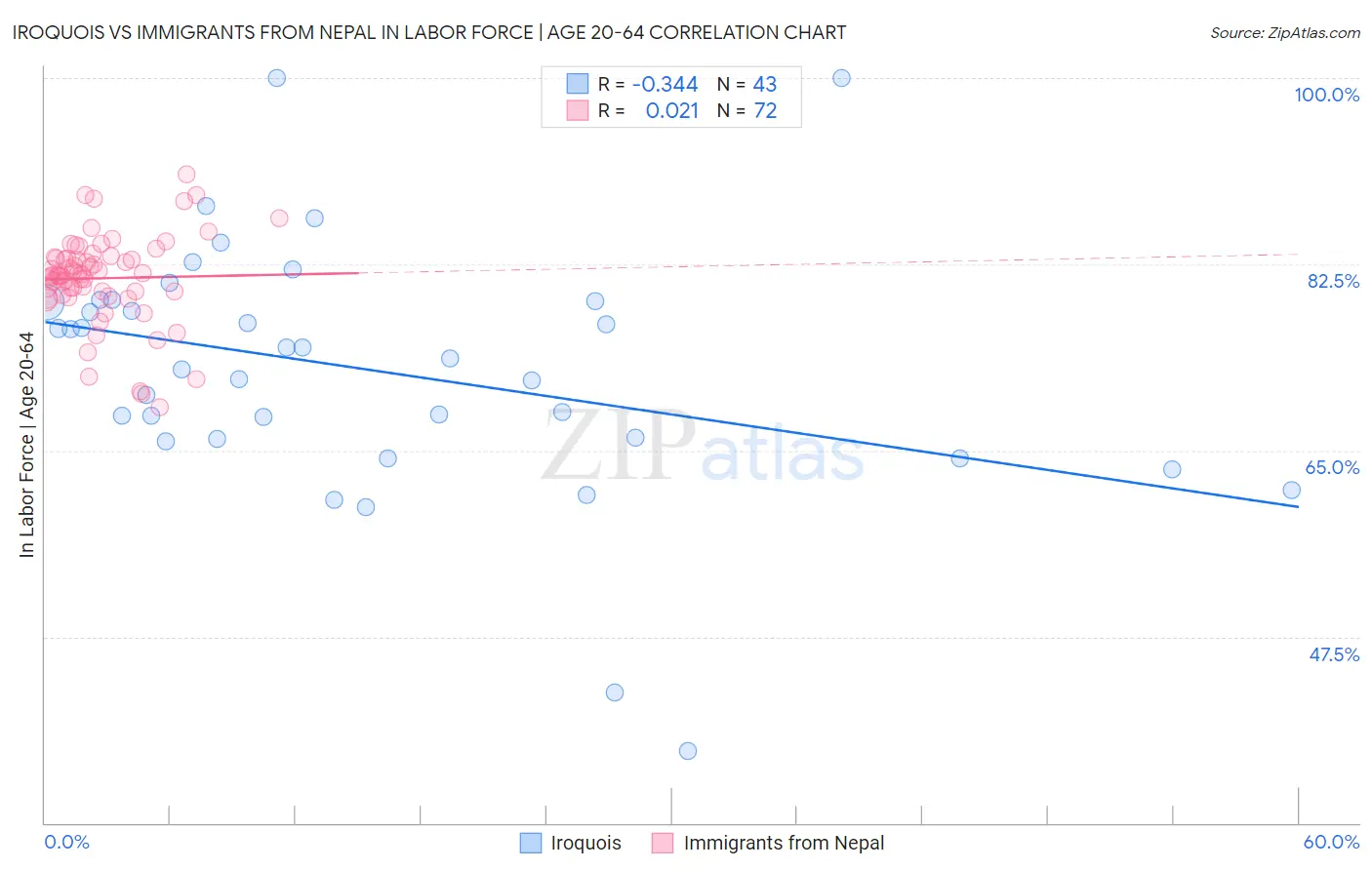 Iroquois vs Immigrants from Nepal In Labor Force | Age 20-64 Correlation Chart
