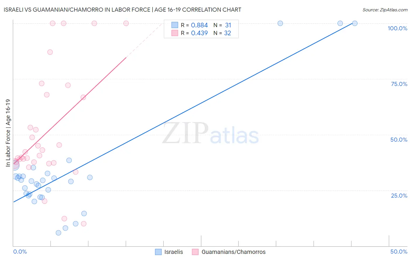 Israeli vs Guamanian/Chamorro In Labor Force | Age 16-19 Correlation Chart