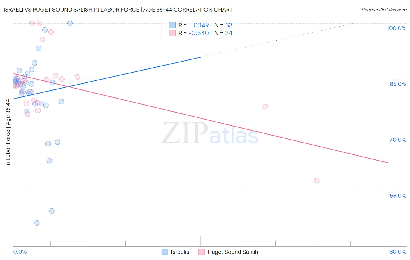 Israeli vs Puget Sound Salish In Labor Force | Age 35-44 Correlation Chart