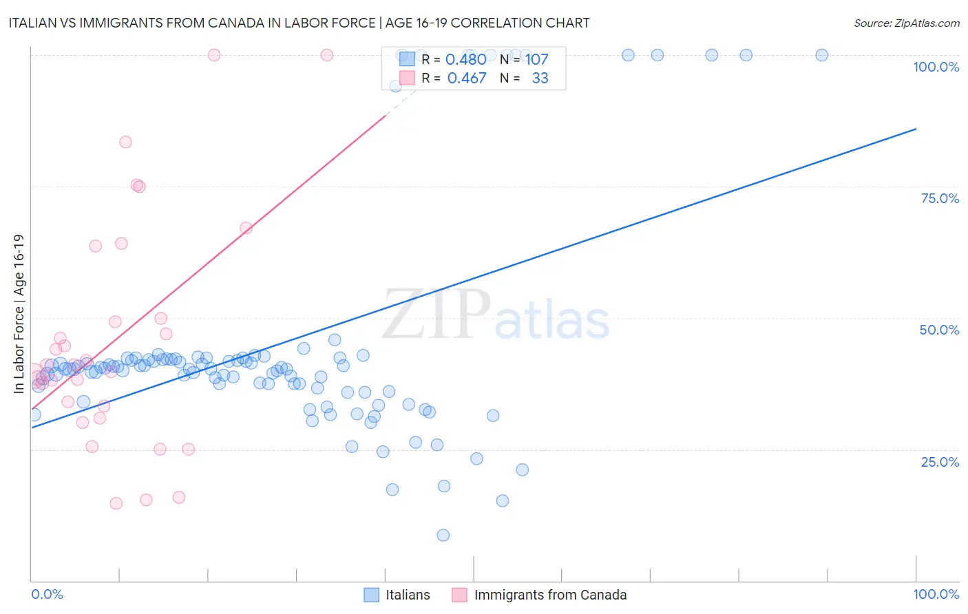 Italian vs Immigrants from Canada In Labor Force | Age 16-19 Correlation Chart
