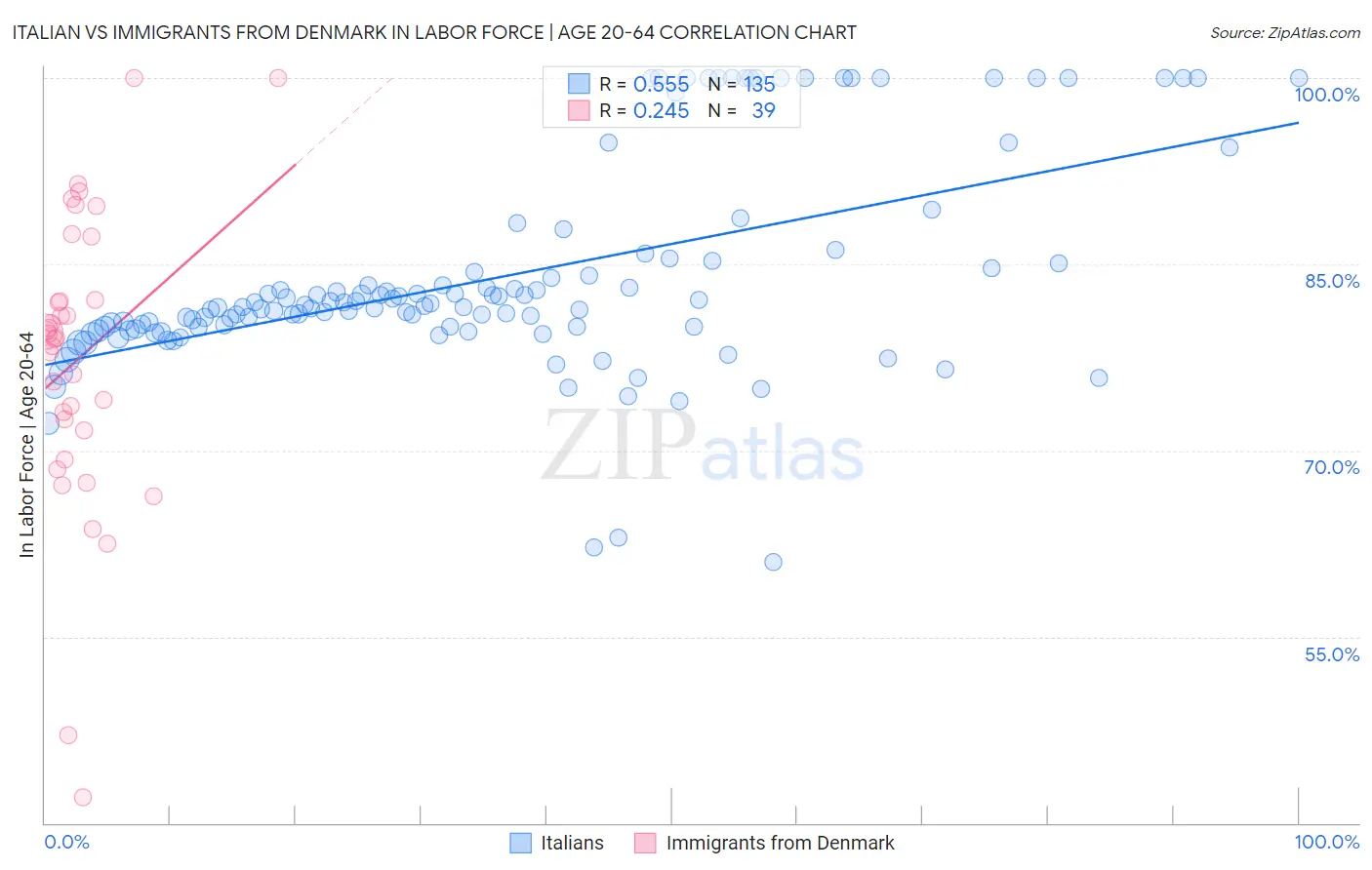 Italian vs Immigrants from Denmark In Labor Force | Age 20-64 Correlation Chart