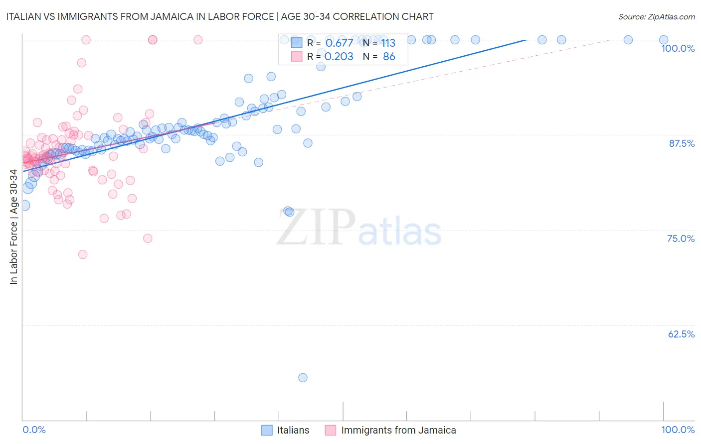 Italian vs Immigrants from Jamaica In Labor Force | Age 30-34 Correlation Chart