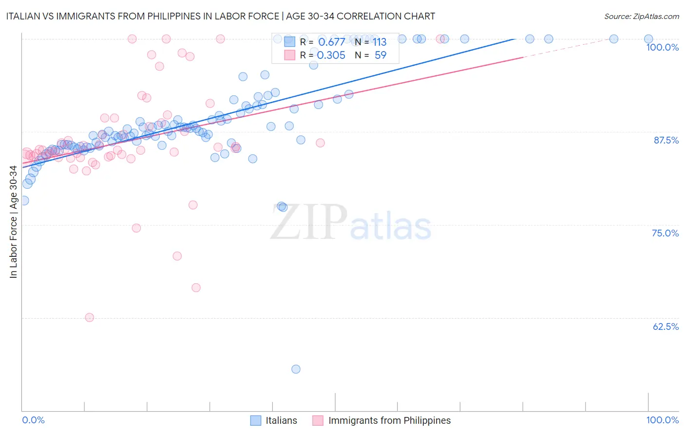 Italian vs Immigrants from Philippines In Labor Force | Age 30-34 Correlation Chart