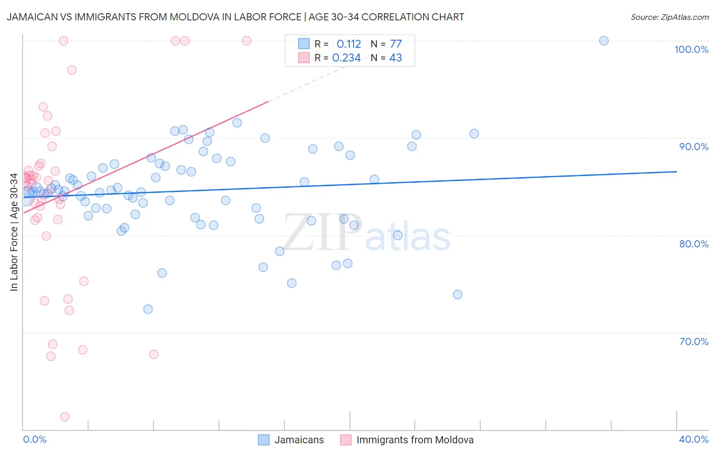 Jamaican vs Immigrants from Moldova In Labor Force | Age 30-34 Correlation Chart