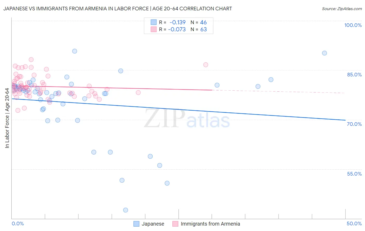 Japanese vs Immigrants from Armenia In Labor Force | Age 20-64 Correlation Chart