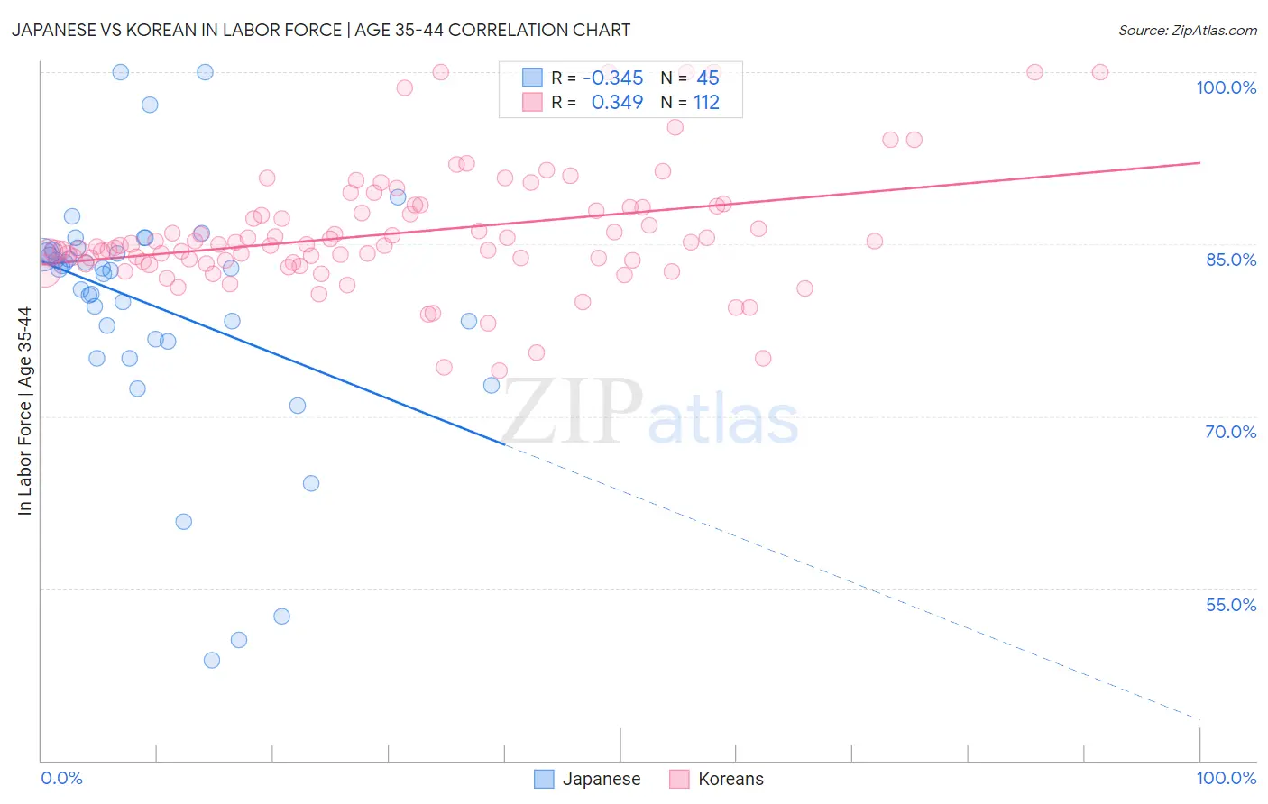 Japanese vs Korean In Labor Force | Age 35-44 Correlation Chart
