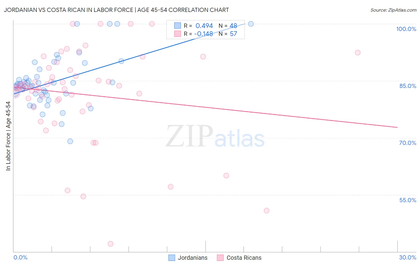 Jordanian vs Costa Rican In Labor Force | Age 45-54 Correlation Chart