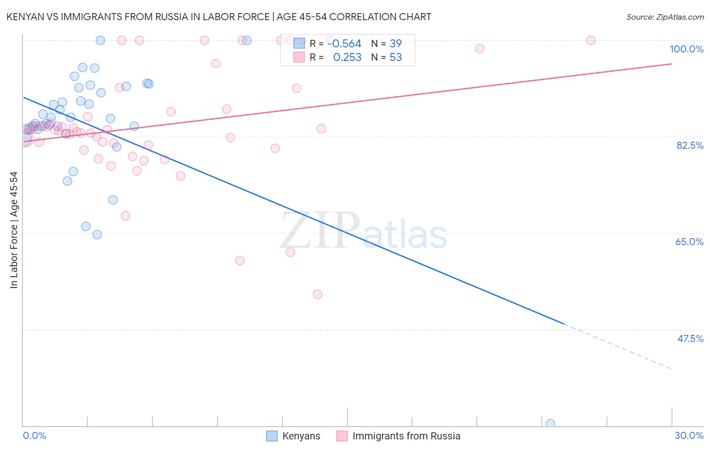 Kenyan vs Immigrants from Russia In Labor Force | Age 45-54 Correlation Chart