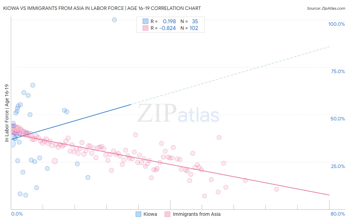Kiowa vs Immigrants from Asia In Labor Force | Age 16-19 Correlation Chart