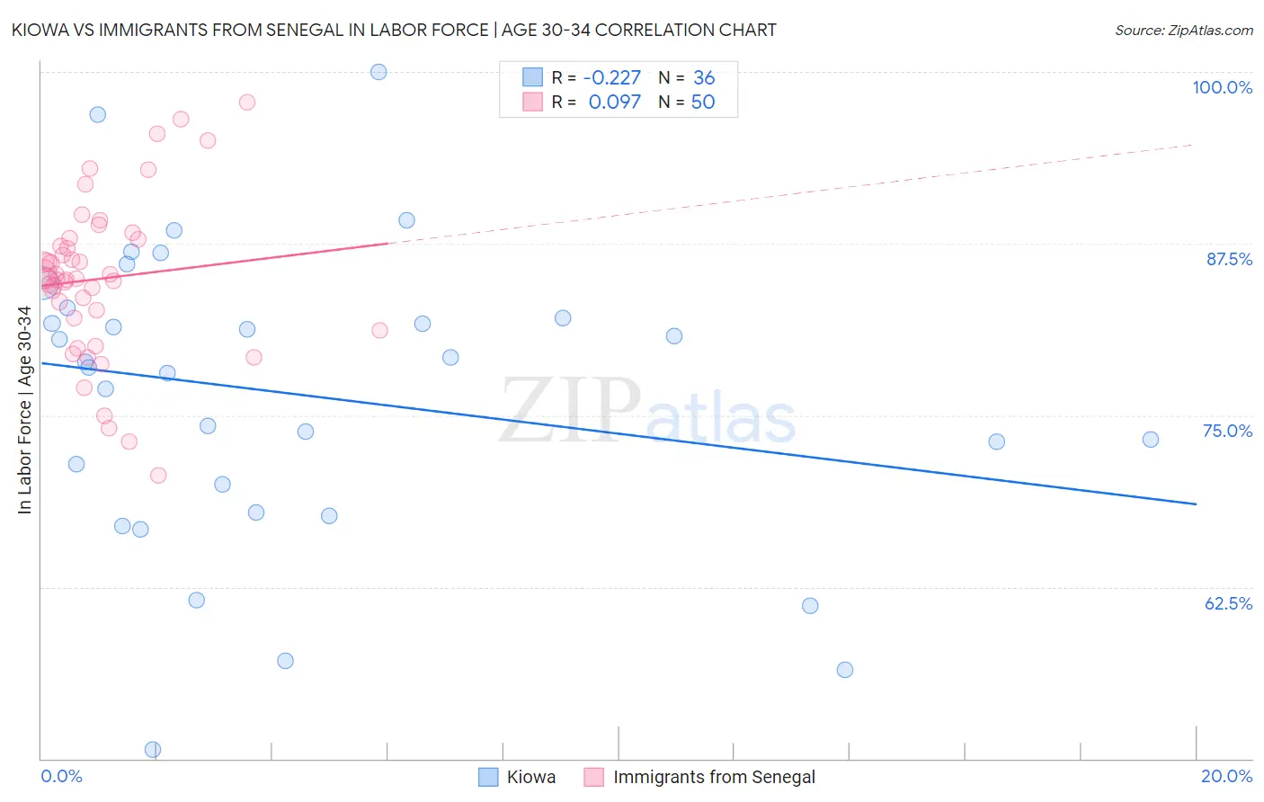 Kiowa vs Immigrants from Senegal In Labor Force | Age 30-34 Correlation Chart
