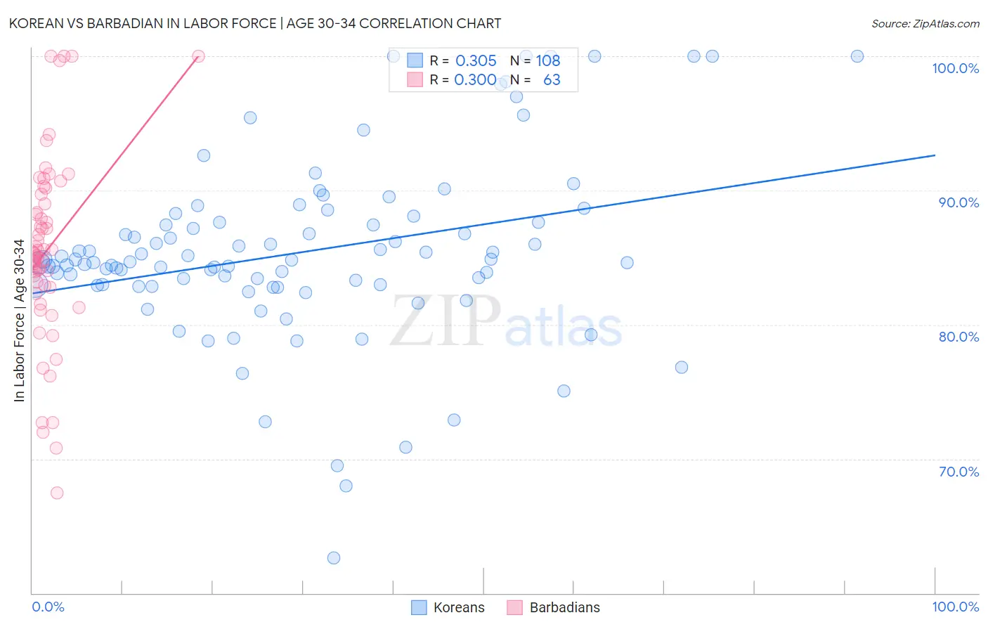 Korean vs Barbadian In Labor Force | Age 30-34 Correlation Chart