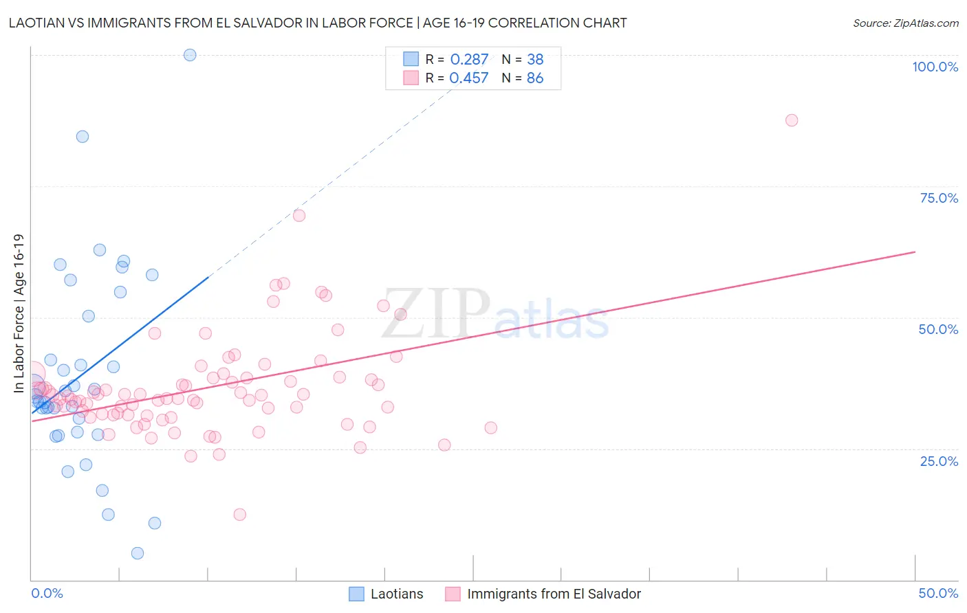 Laotian vs Immigrants from El Salvador In Labor Force | Age 16-19 Correlation Chart