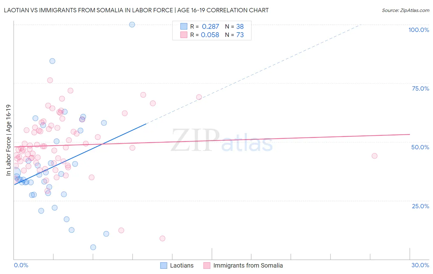 Laotian vs Immigrants from Somalia In Labor Force | Age 16-19 Correlation Chart