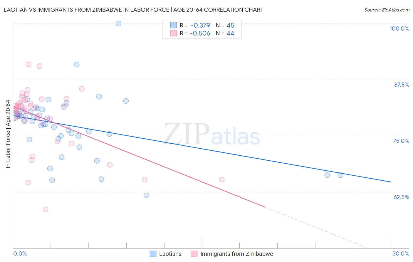 Laotian vs Immigrants from Zimbabwe In Labor Force | Age 20-64 Correlation Chart