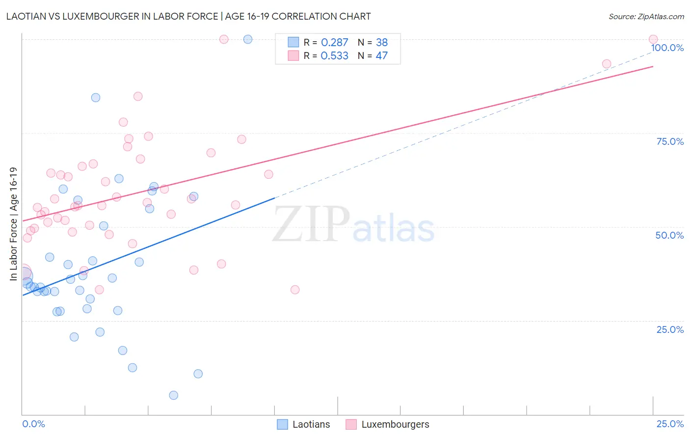 Laotian vs Luxembourger In Labor Force | Age 16-19 Correlation Chart