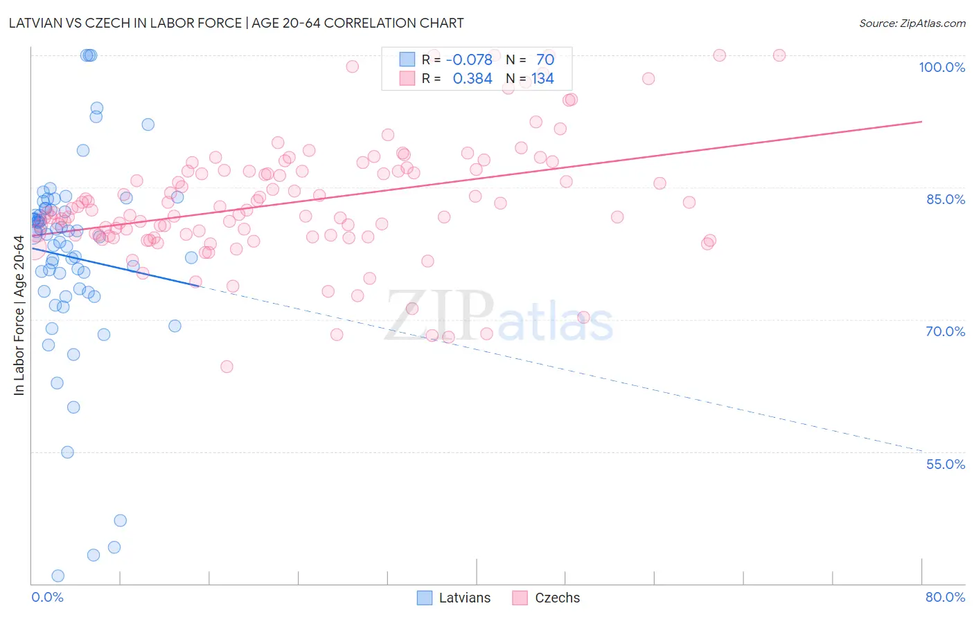 The statistical analysis conducted on geographies consisting of 220,728,272 people shows a slight negative correlation between the proportion of Latvians and labor force participation rate among population between the ages 20 and 64 in the United States with a correlation coefficient (R) of -0.078 and weighted average of 80.5%. Similarly, the statistical analysis conducted on geographies consisting of 484,822,871 people shows a mild positive correlation between the proportion of Czechs and labor force participation rate among population between the ages 20 and 64 in the United States with a correlation coefficient (R) of 0.384 and weighted average of 80.5%, a difference of 0.010%.