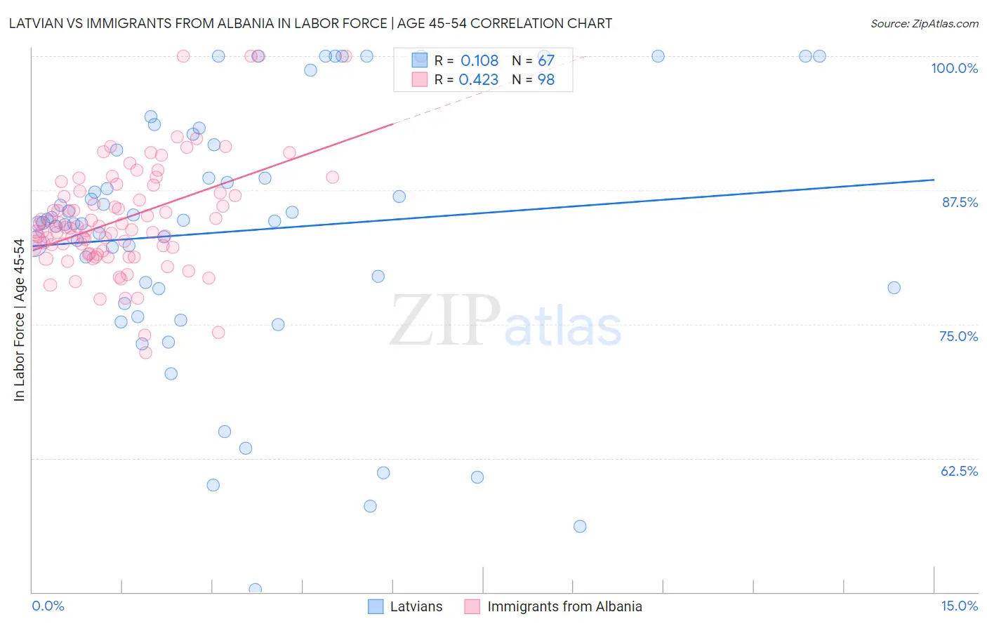 Latvian vs Immigrants from Albania In Labor Force | Age 45-54 Correlation Chart