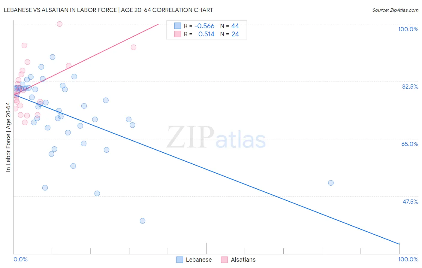 Lebanese vs Alsatian In Labor Force | Age 20-64 Correlation Chart