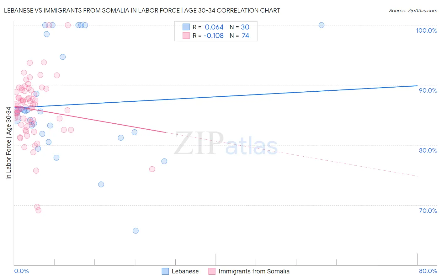 Lebanese vs Immigrants from Somalia In Labor Force | Age 30-34 Correlation Chart