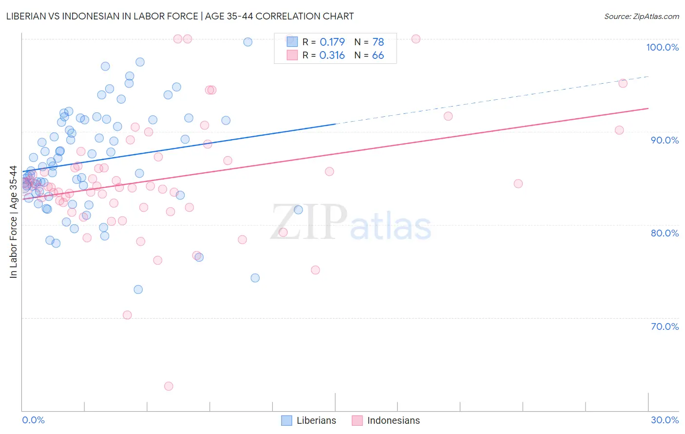 Liberian vs Indonesian In Labor Force | Age 35-44 Correlation Chart