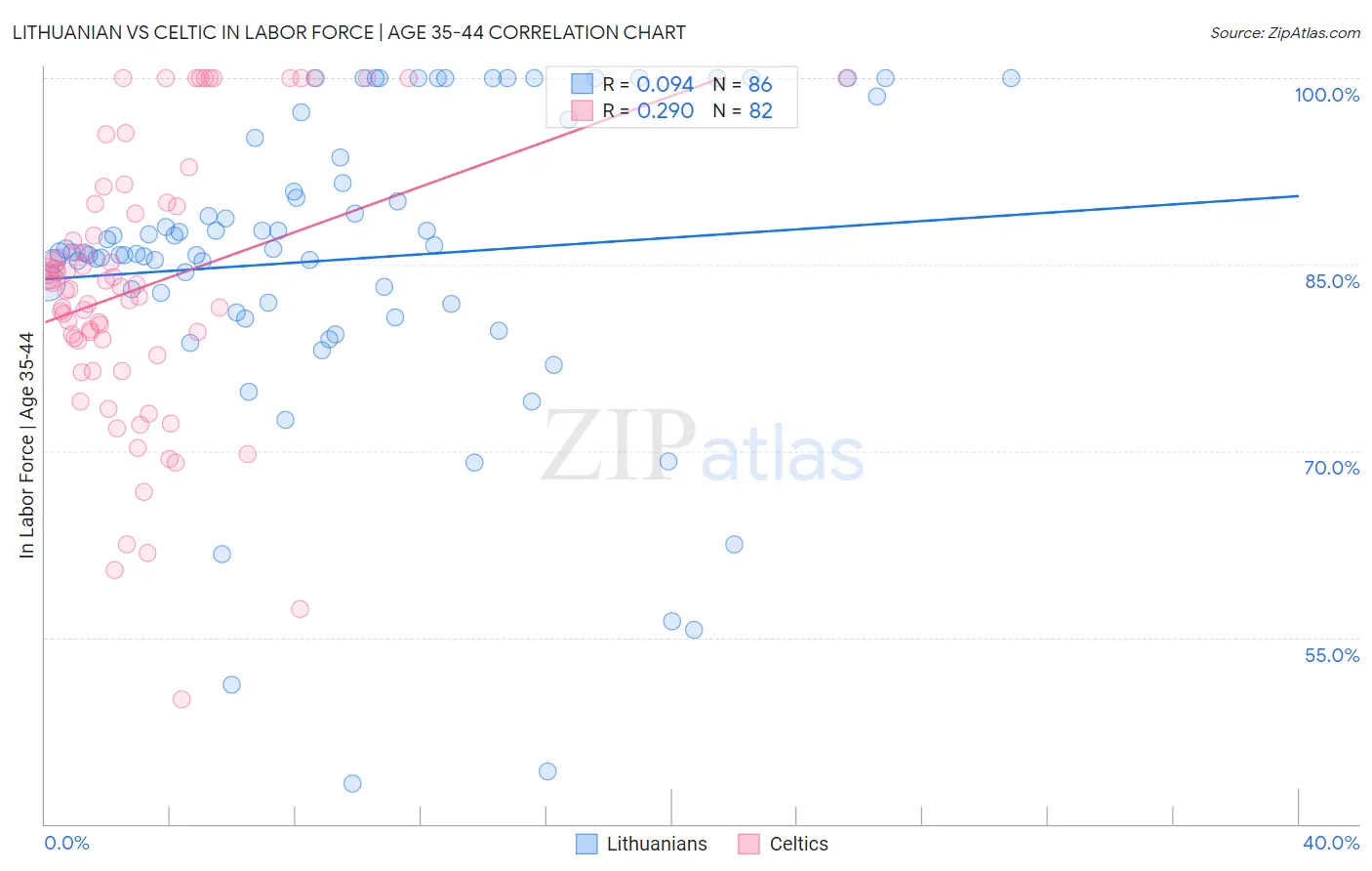 Lithuanian vs Celtic In Labor Force | Age 35-44 Correlation Chart