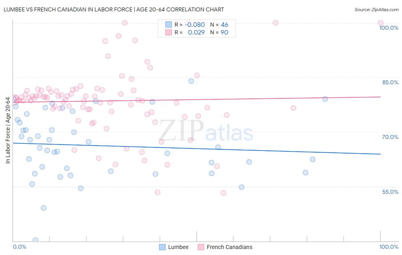 Lumbee vs French Canadian In Labor Force | Age 20-64 Correlation Chart
