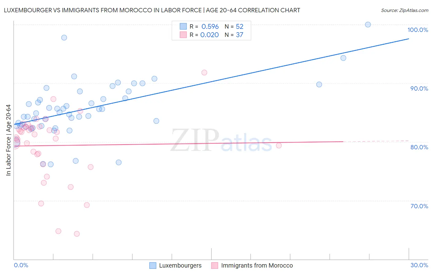 Luxembourger vs Immigrants from Morocco In Labor Force | Age 20-64 Correlation Chart