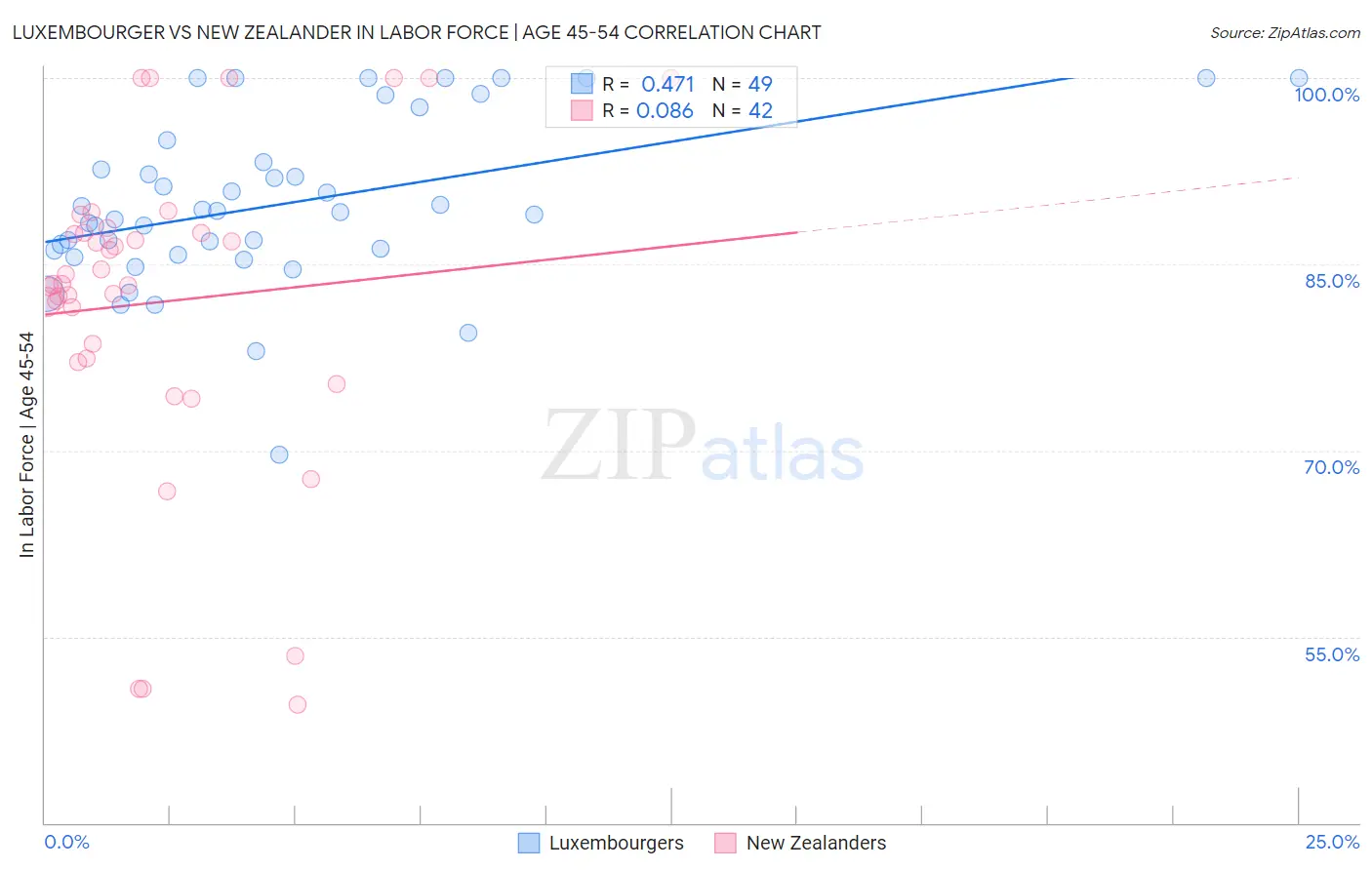 Luxembourger vs New Zealander In Labor Force | Age 45-54 Correlation Chart