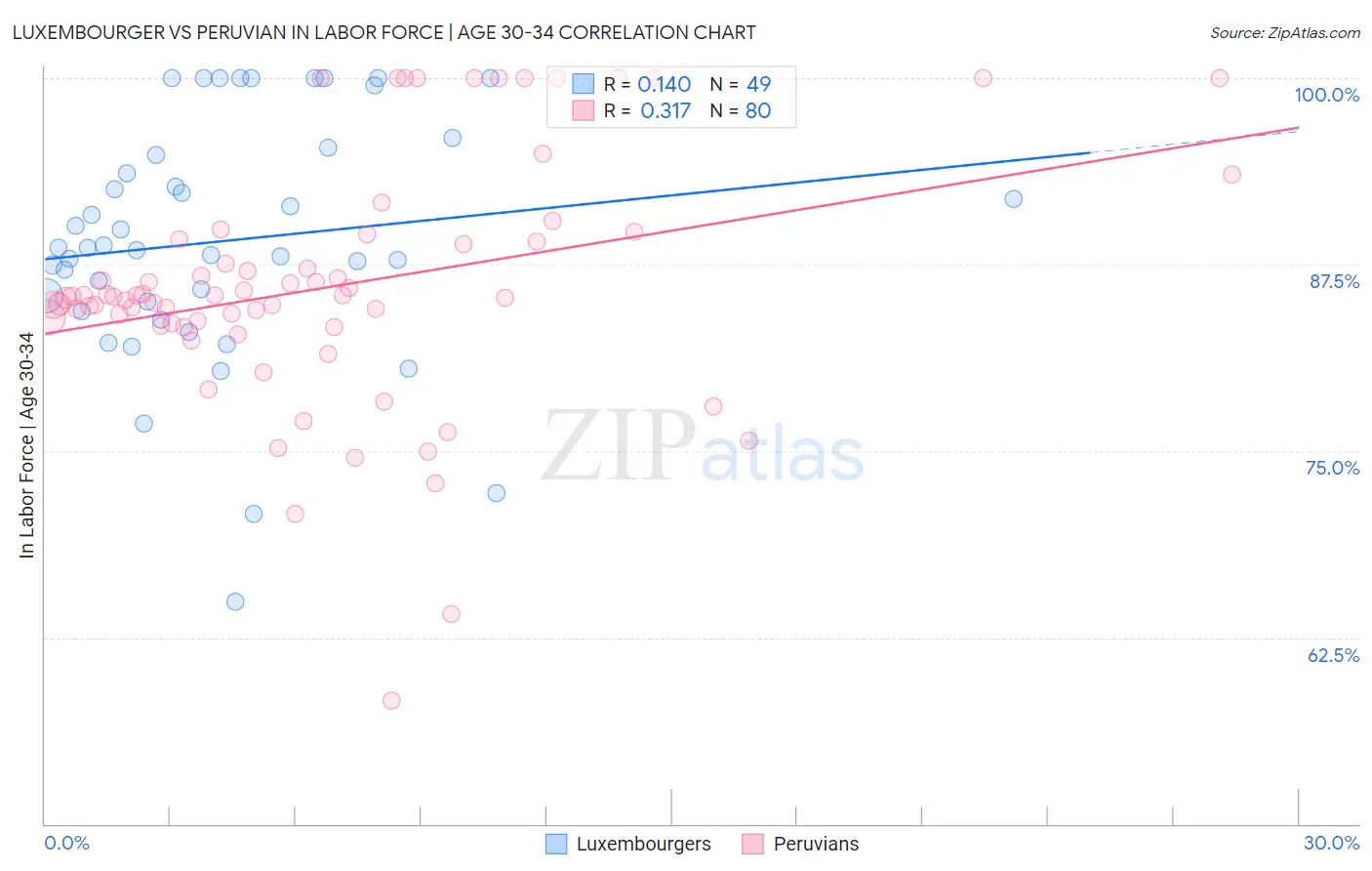 Luxembourger vs Peruvian In Labor Force | Age 30-34 Correlation Chart