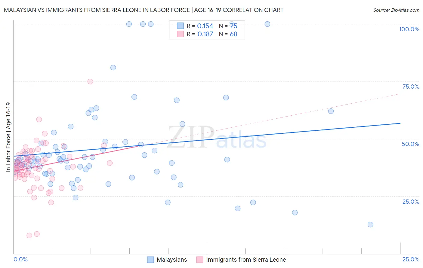 Malaysian vs Immigrants from Sierra Leone In Labor Force | Age 16-19 Correlation Chart