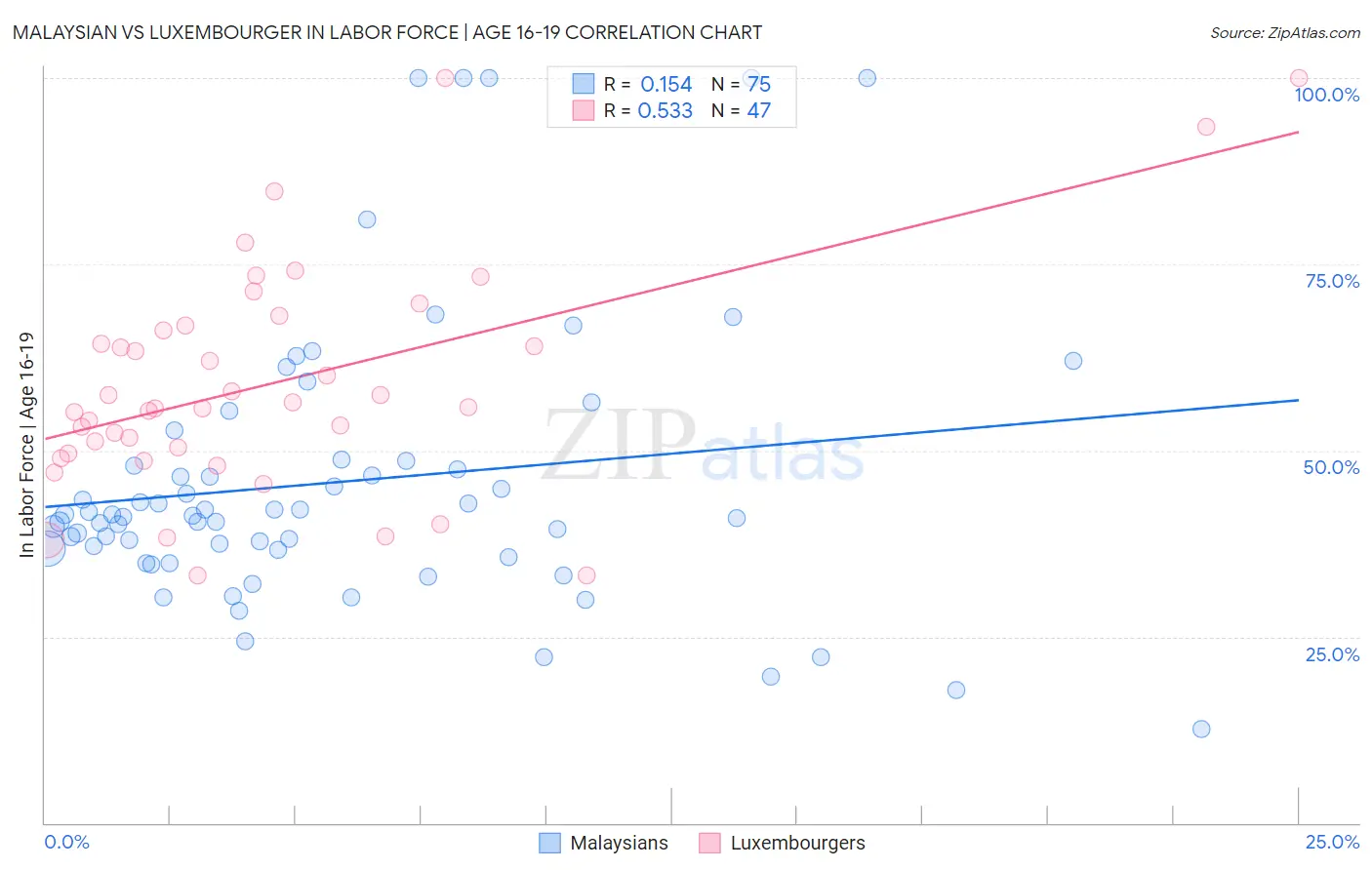 Malaysian vs Luxembourger In Labor Force | Age 16-19 Correlation Chart